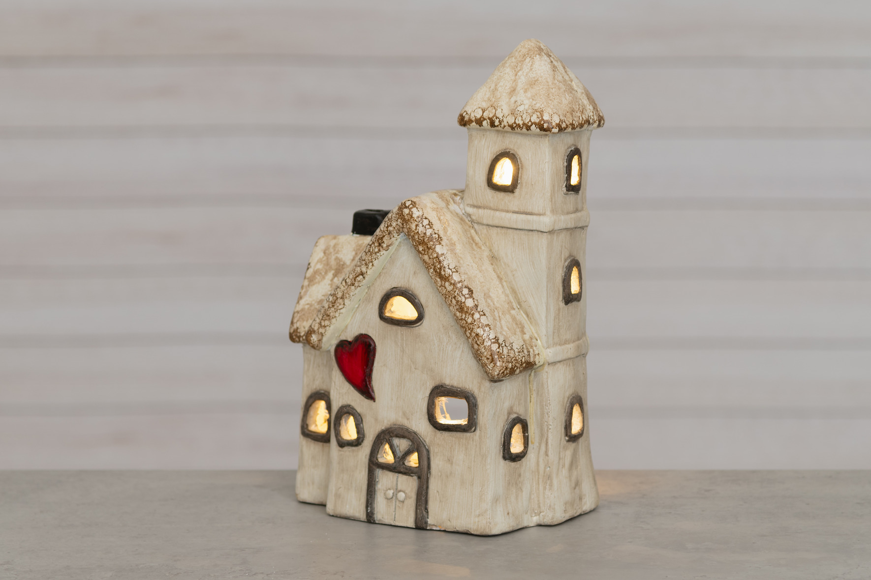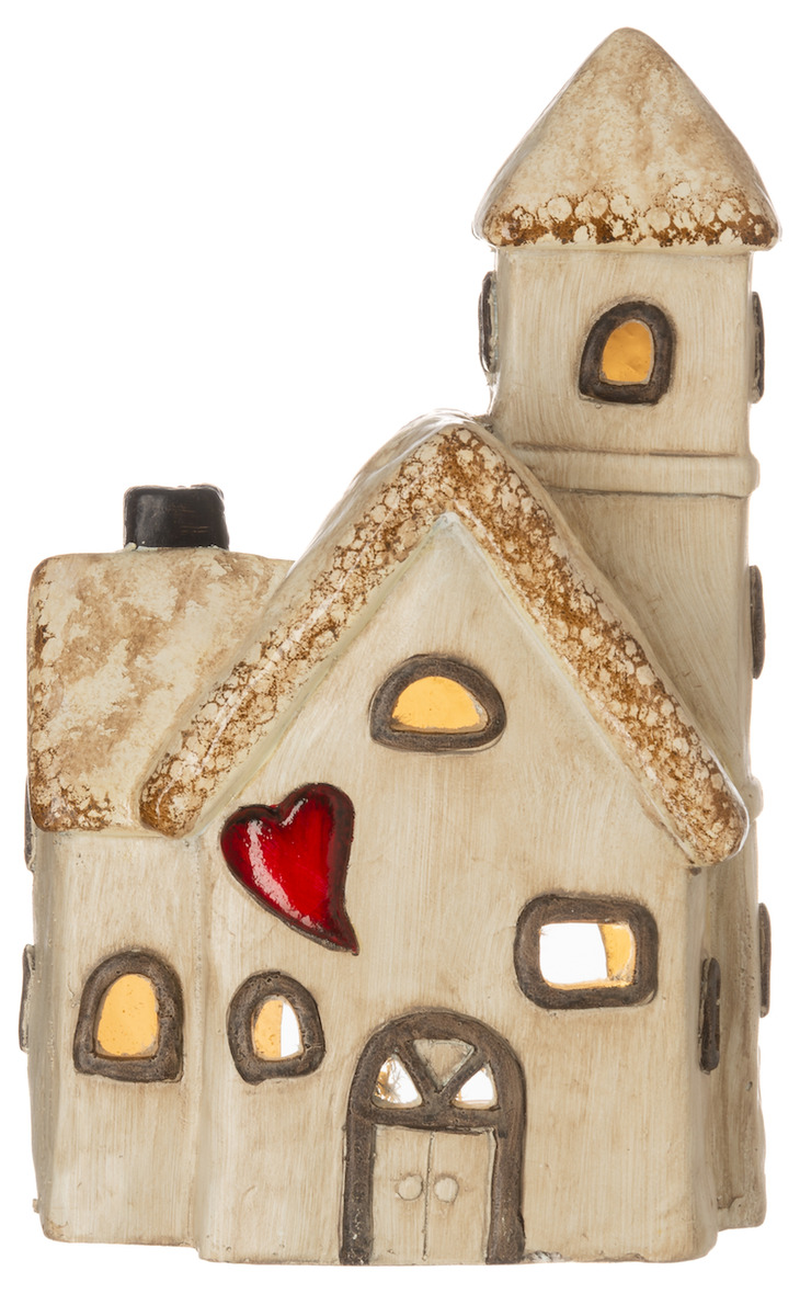 Ett vackert hus i keramikstil med högt torn och röda hjärtdetaljer som ger en extra varm känsla. Den antikvita finishen tillsammans med de små fönstren och snöeffekten på taket gör lyktan till en stämningsfull dekoration som sprider mjukt sken i rummet. Perfekt för att skapa en hemtrevlig atmosfär under årets mörkare månader.