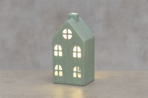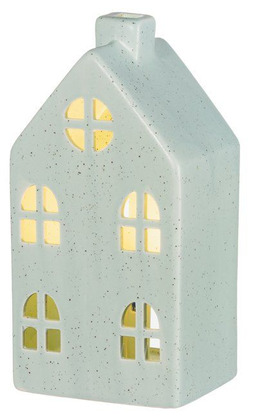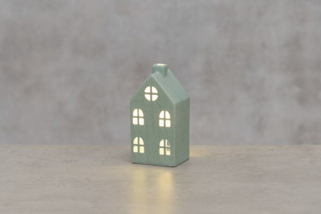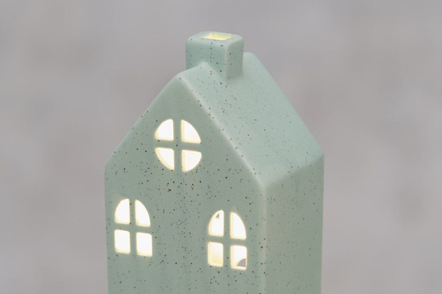 Ett stilrent litet hus i keramik som sprider ett mjukt och rogivande sken genom sina klassiska fönster. Den dova gröna tonen och den enkla formen gör lyktan lätt att placera i både moderna och traditionella hem. Perfekt att kombinera med fler huslyktor för att bygga en stämningsfull liten ljusby.