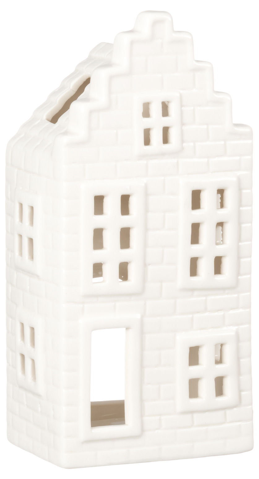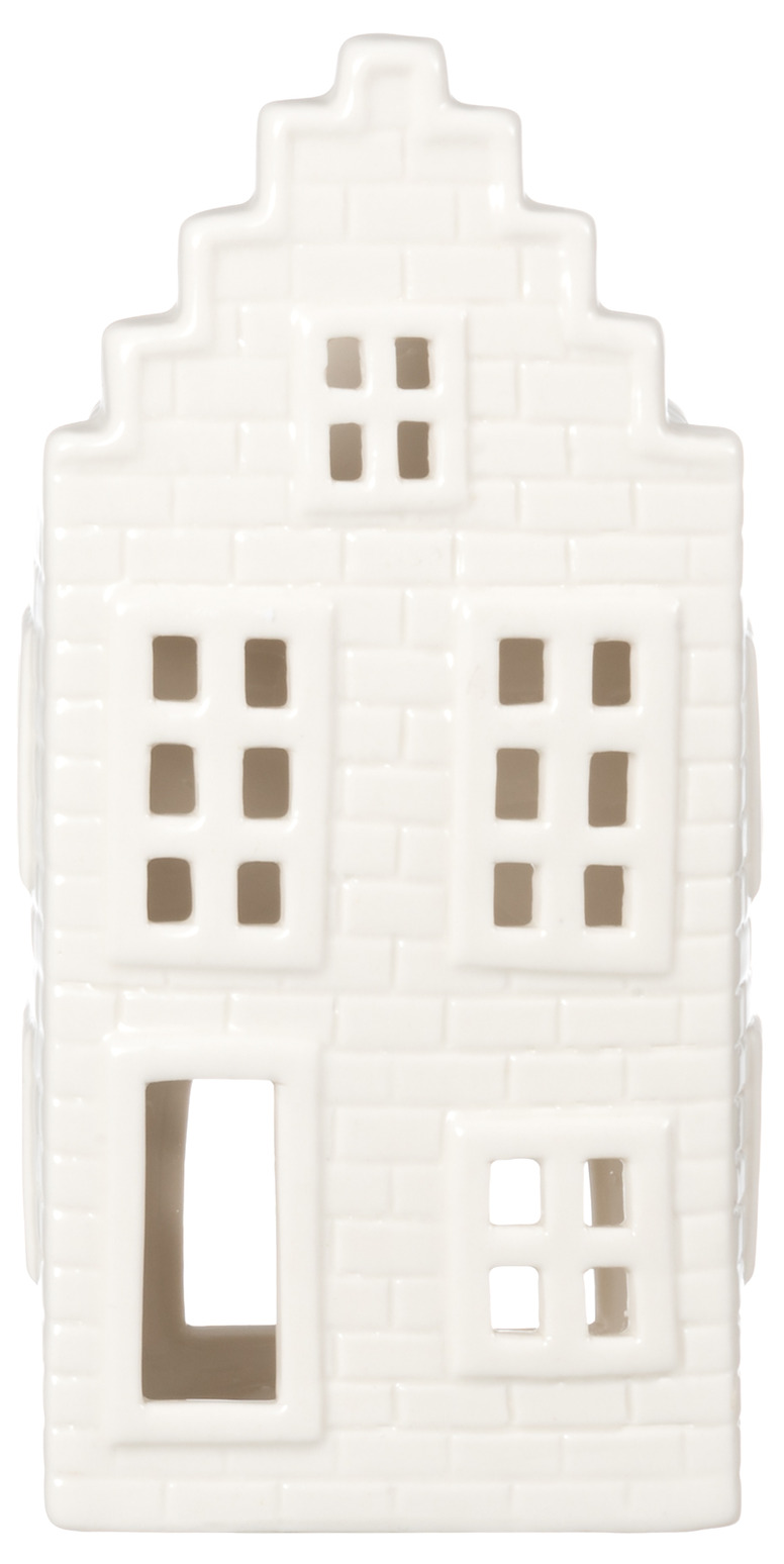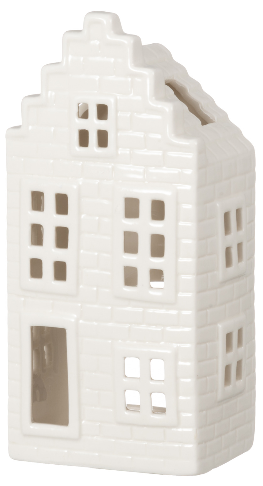 En stilfull ljuslykta i form av ett högt hus med vackert trappstegstak. Den vita fasaden med sina många fönster gör att ljuset sprider sig på ett stämningsfullt sätt när du tänder ett ljus inuti.