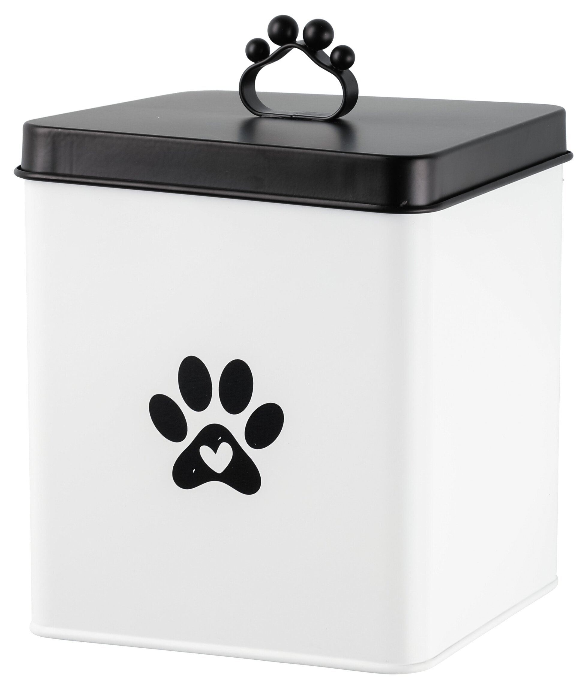 Denna praktiska förvaringsburk i metall rymmer upp till 3 liter och passar perfekt för torrfoder eller favoritsnacks till våra fyrbenta favoriter. Den vita designen med svart tassavtryck gör den både dekorativ och funktionell i köket. Locket håller innehållet fräscht och har ett charmigt handtag format som en tass – en liten detalj som gör stor skillnad.