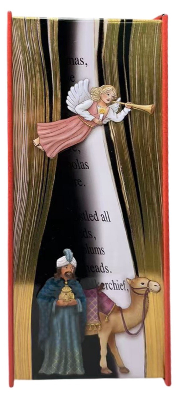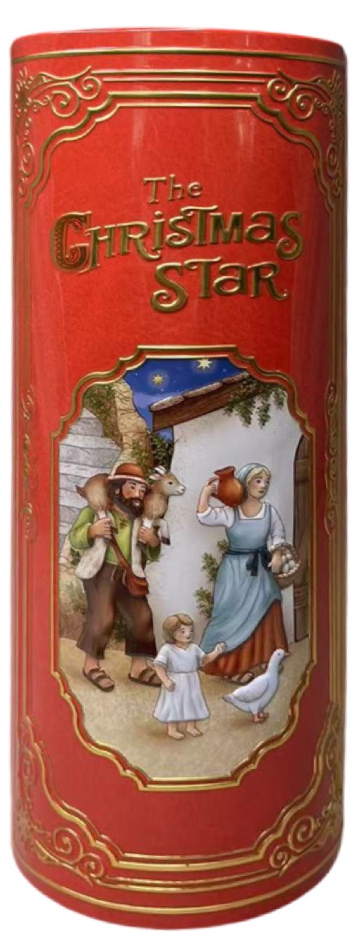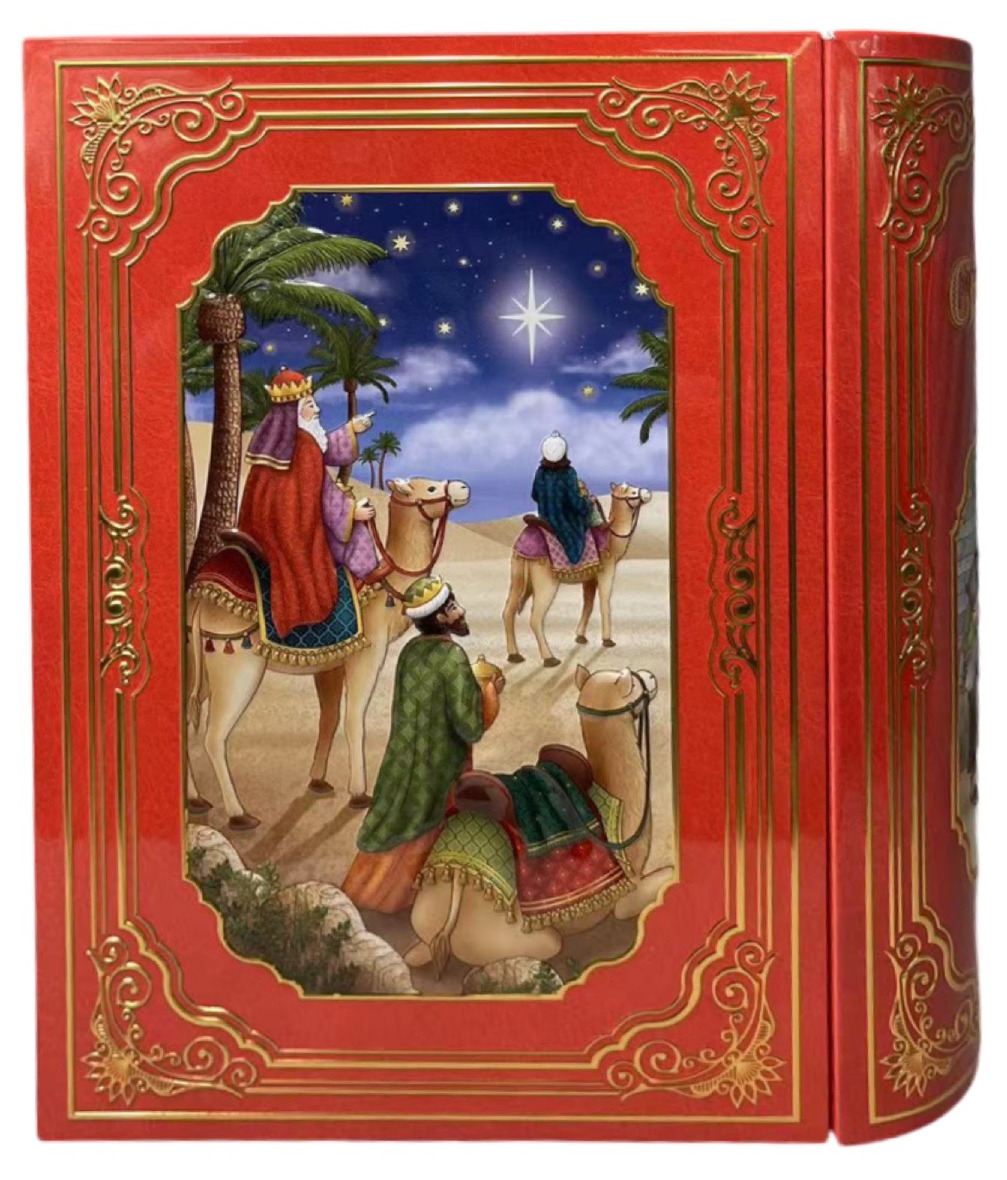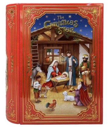 Dekorativ plåtburk utformad som en bok med julmotiv, passar fint till förvaring av julkakor & godis.