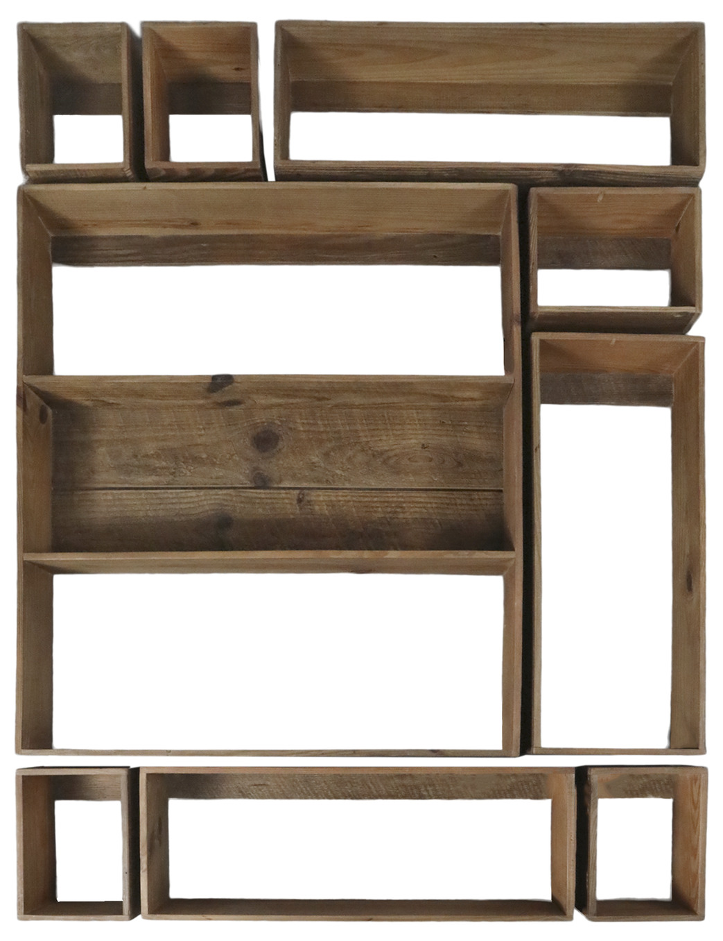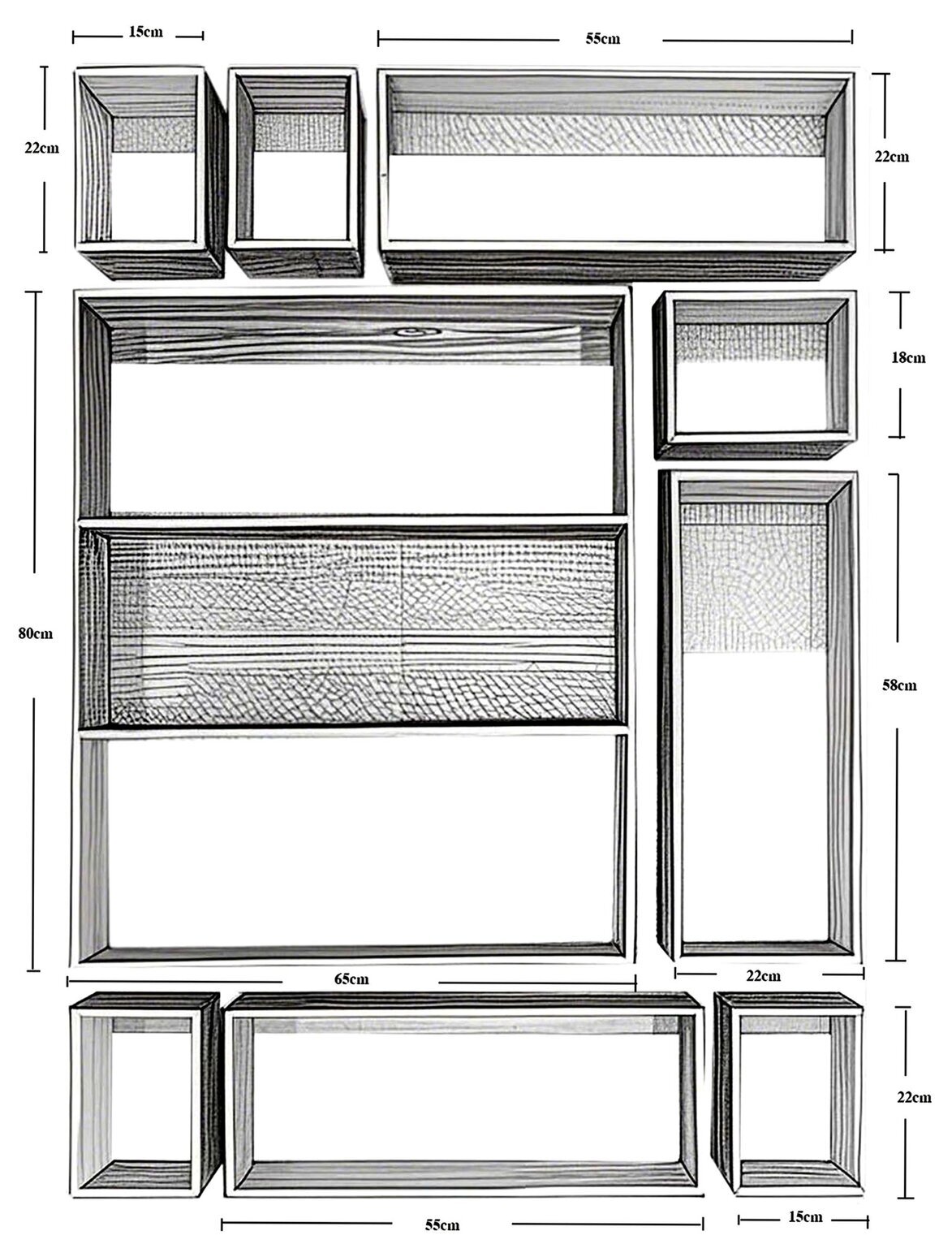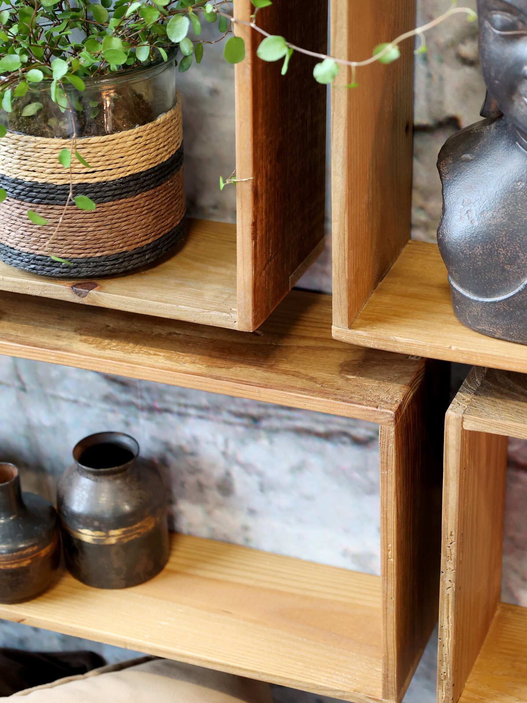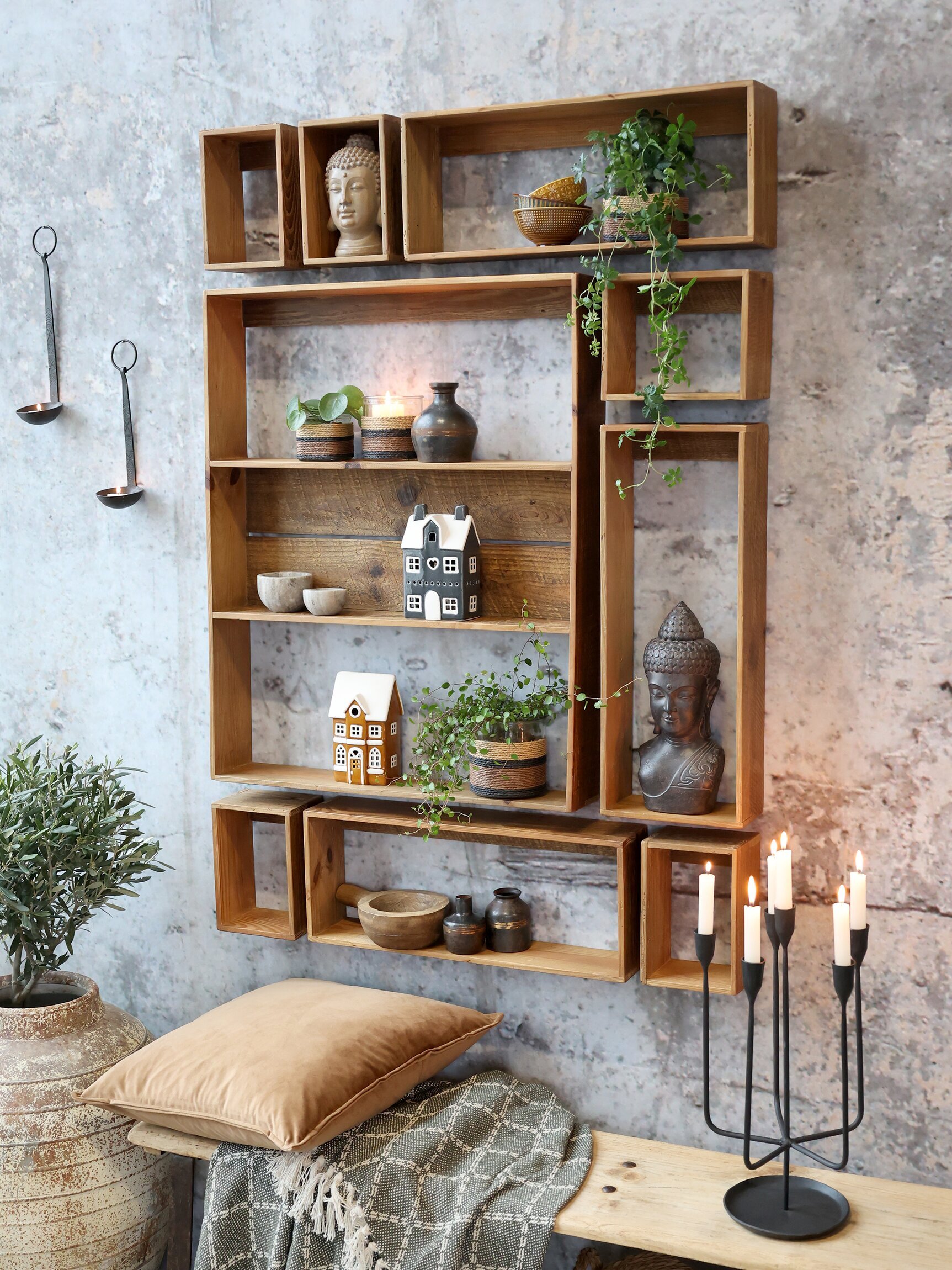 Skapa en personlig och levande känsla i hemmet med denna dekorativa vägg­hylla i trä. De olika stora facken ger plats för både böcker, växter, ljus och dina favoritdetaljer. Tillverkad i rustikt trä som framhäver en varm och naturlig känsla – perfekt för att lyfta fram det du tycker mest om.