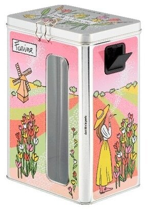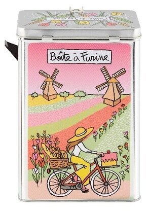 Ge ditt kök en färgglad och nostalgisk touch med denna härliga plåtburk för mjöl. Burken pryds av ett romantiskt motiv med cykeltur, tulpaner och vindmöllor – en design som för tankarna till blomstrande sommarängar. Den praktiska fönsteröppningen gör det enkelt att se innehållet, och tack vare pipen blir det smidigt att hälla utan spill. Perfekt för dig som vill kombinera funktion med dekoration i köket.