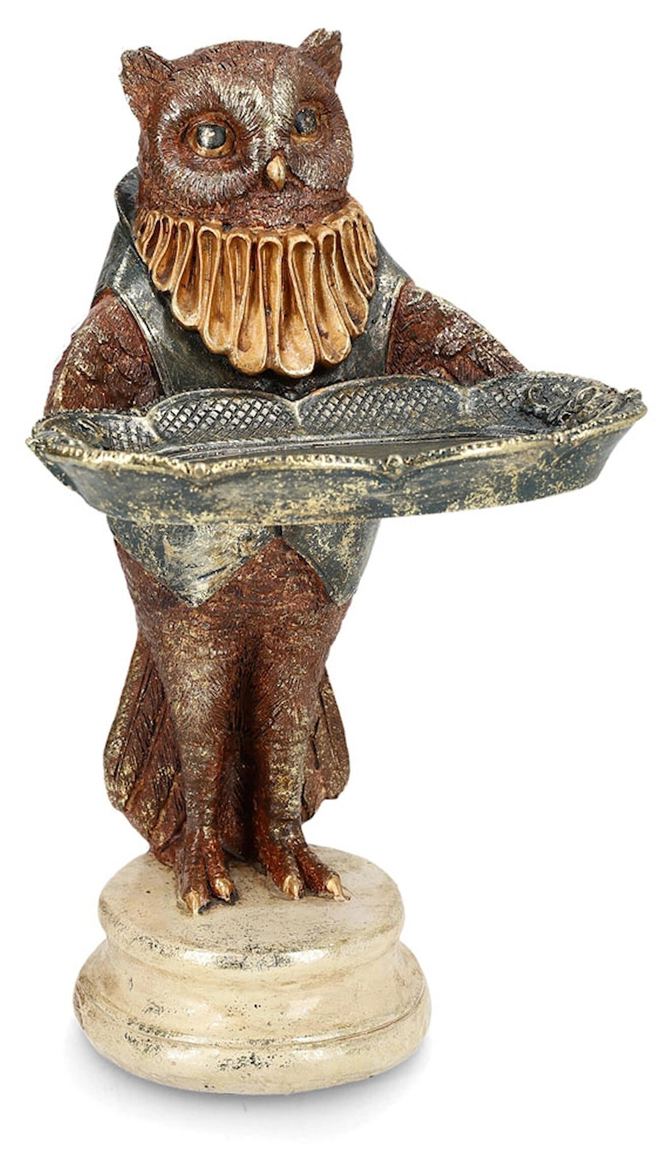 En charmig uggla som bär en bricka – perfekt som lekfull inredningsdetalj. Figuren är rikt dekorerad med vackra färger och fina detaljer, vilket gör den till en rolig och annorlunda accent i hemmet.