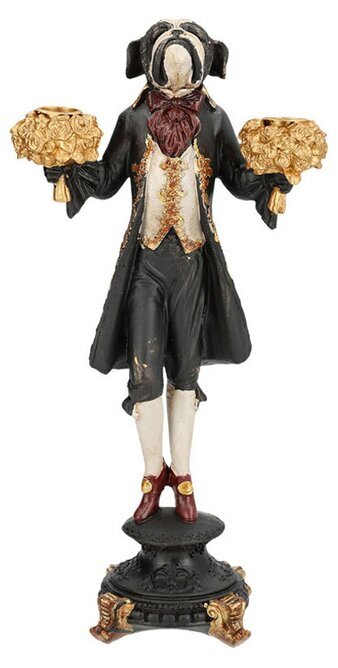 En dekorativ och unik ljusstake i form av en bulldogg i elegant klädsel. Figuren håller två buketter i händerna, där ljushållarna är placerade – ett fantasifullt och charmigt sätt att lysa upp rummet.