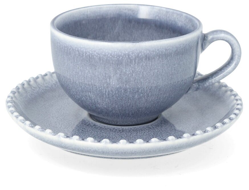 Njut av kaffe eller te i denna vackra kopp med tillhörande fat. Den mjukt blå glasyren och den dekorativa pärlkanten skapar en elegant känsla som förhöjer varje fikastund.
