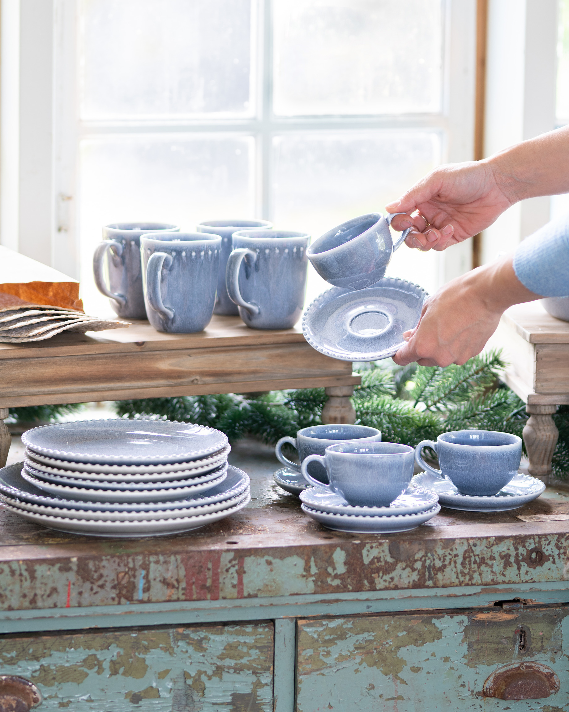 Njut av kaffe eller te i denna vackra kopp med tillhörande fat. Den mjukt blå glasyren och den dekorativa pärlkanten skapar en elegant känsla. Läs mer