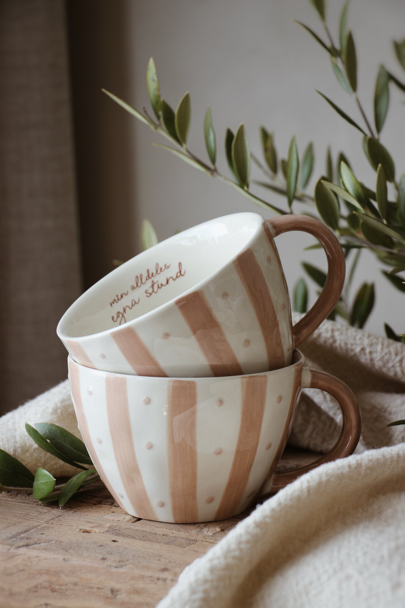 Unna dig en varm kopp te eller kaffe i denna charmiga feelgood-mugg. Med sina mjuka, handmålade ränder och prickar i naturtoner sprider den både lugn och värme. På insidan väntar orden “min alldeles egna stund” – en påminnelse om att ta tid för dig själv och njuta av det lilla i vardagen. Perfekt som present, eller som en uppskattad favoritmugg i ditt eget hem.