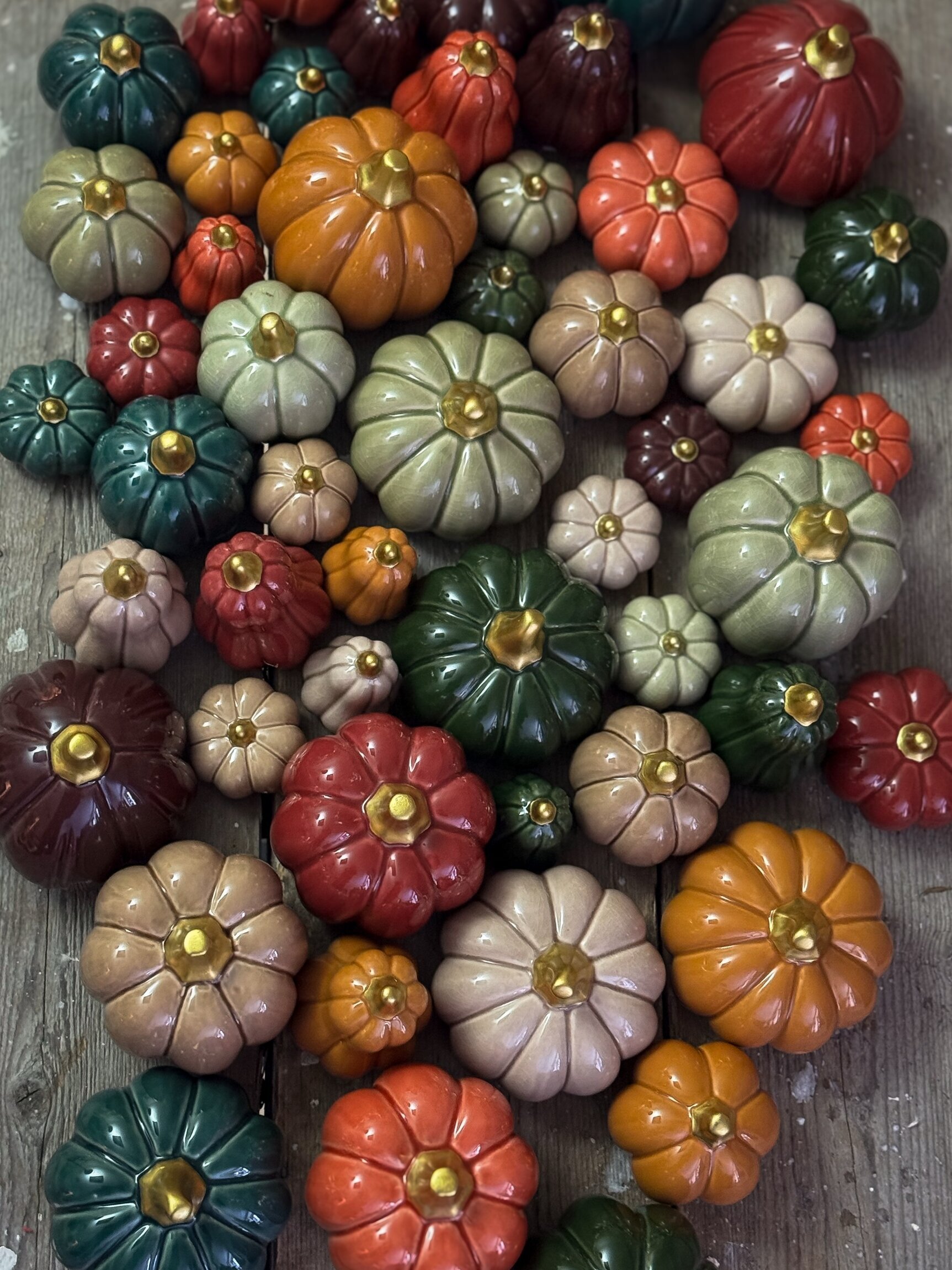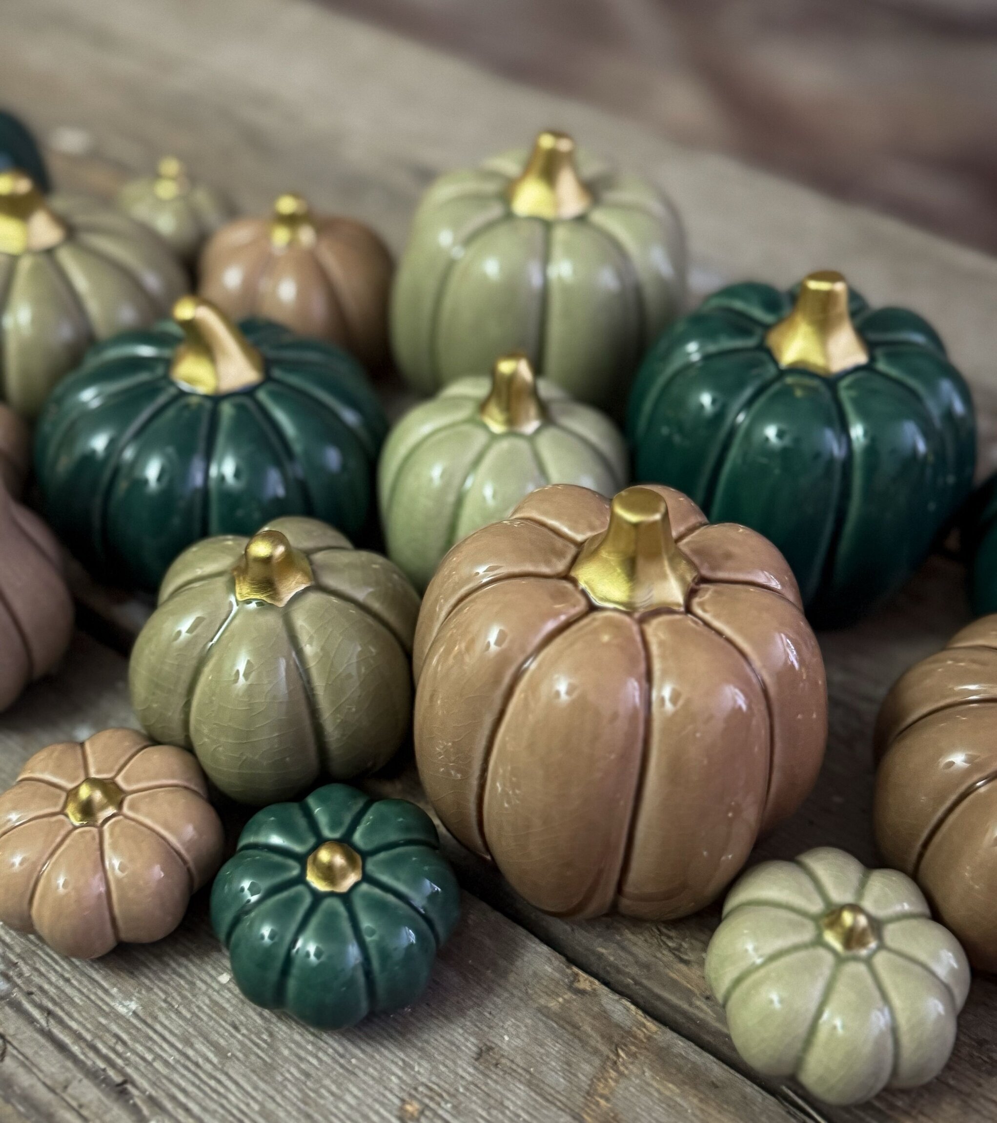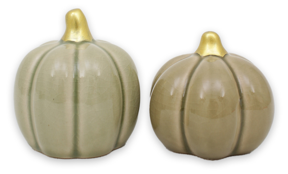 Charmiga dekorationspumpor i keramik blir en perfekt detalj till ditt hem. Med sin eleganta, blanka yta och gyllene topp ger de en känsla av lyx, samtidigt som deras olika former och vackra färger gör varje pumpa unik.