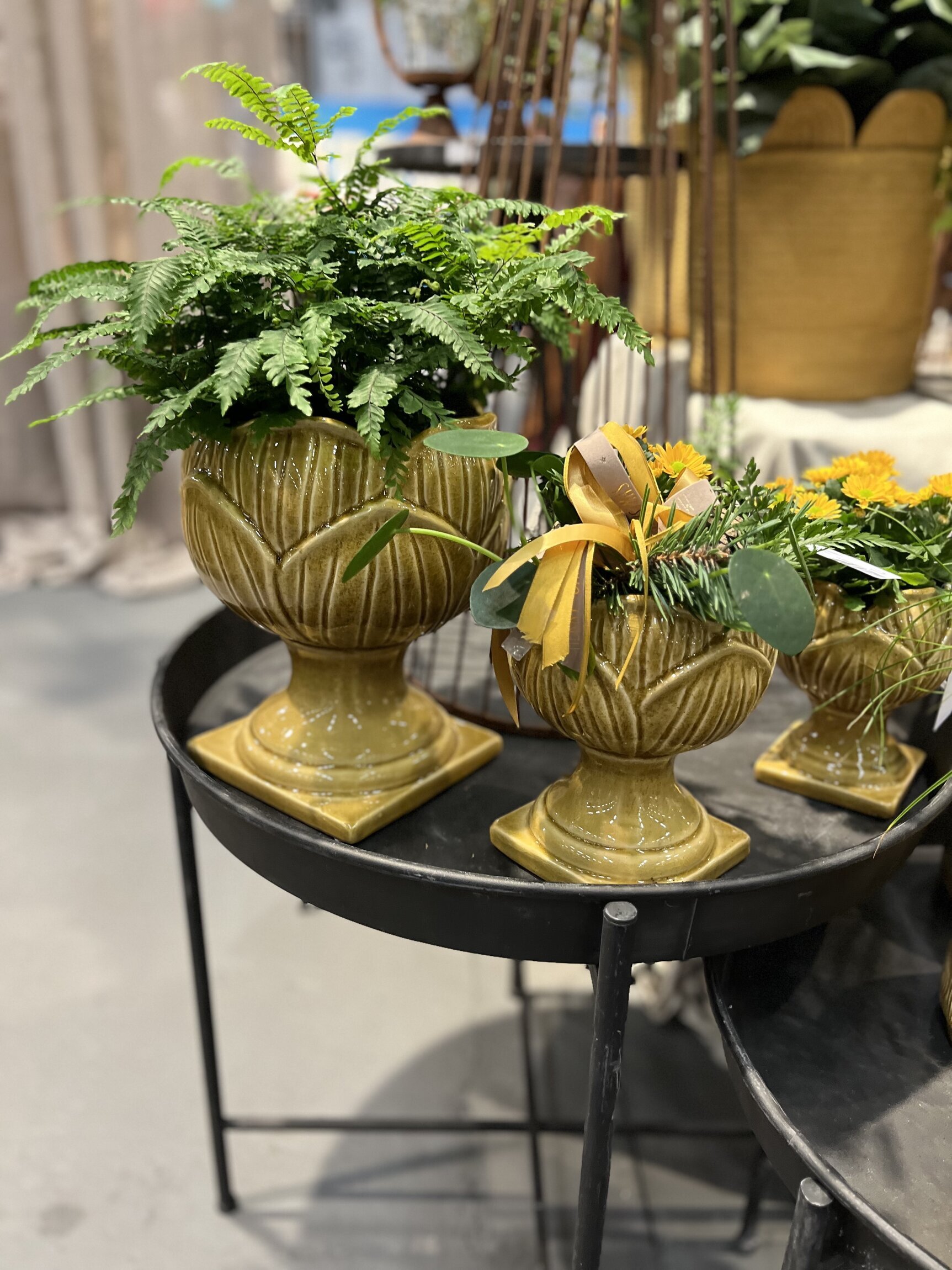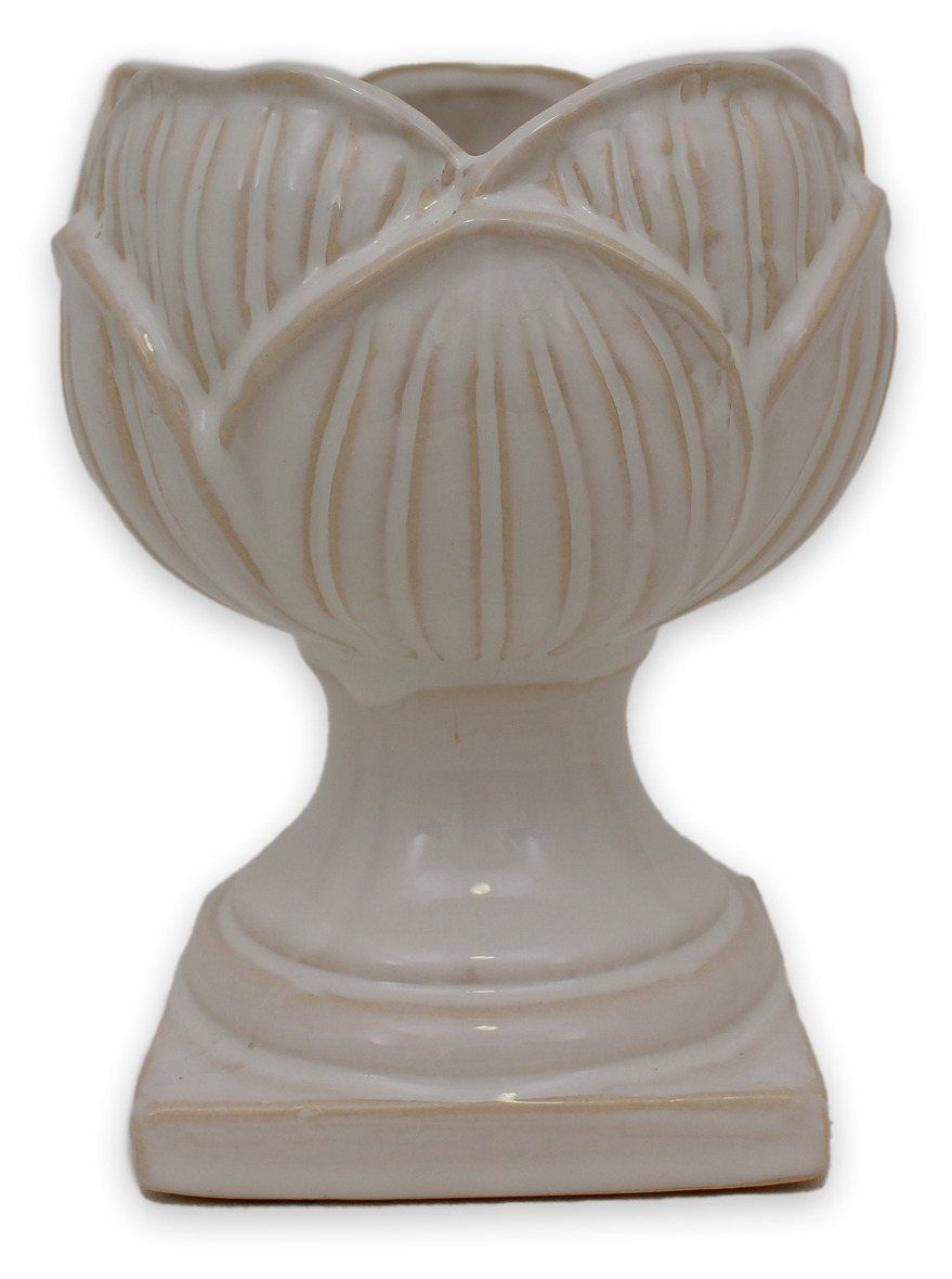 En vacker pokalkruka för inomhusbruk som kombinerar klassisk form med stilfulla detaljer. Den blombladsliknande strukturen gör den till en dekorativ inredningsdetalj i hemmet – perfekt för gröna växter, färgglada blommor eller som kreativ dekoration året runt.