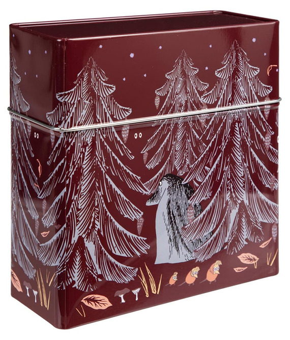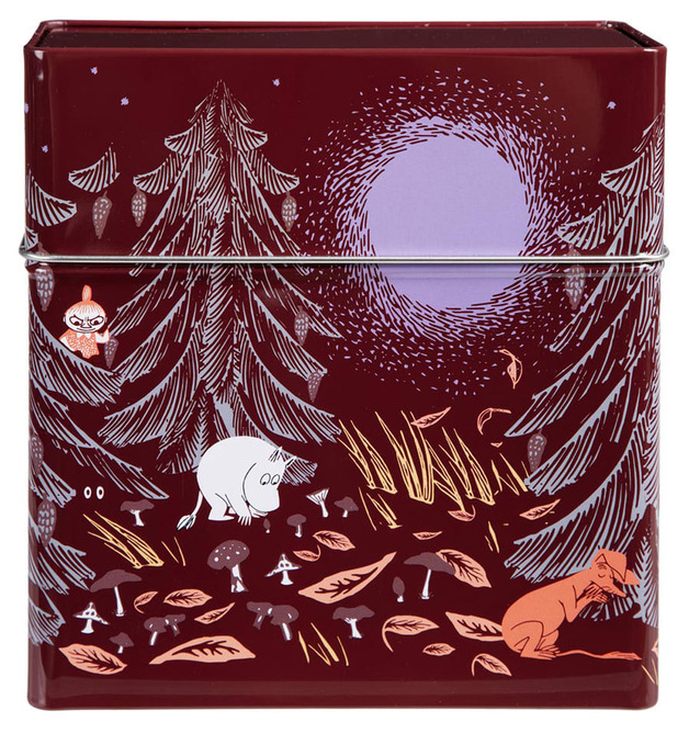 En praktisk och dekorativ plåtburk med lock, perfekt för att förvara kaffefilter eller andra småsaker i köket. Motivet Urskog visar Mumintrollet och hans vänner på en stillsam höstdag i skogen – en scen som utstrålar lugn och harmoni.