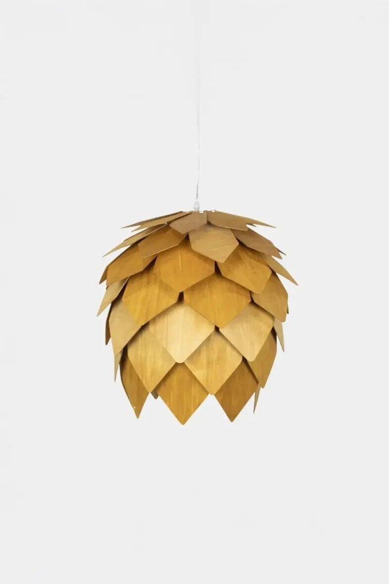 Vacker taklampa tillverkad av tunn plywood i poppelträ och har en form inspirerad av naturens egna mönster. De överlappande träskivorna skapar ett varmt och levande ljusspel som ger rummet en mjuk och inbjudande atmosfär.
