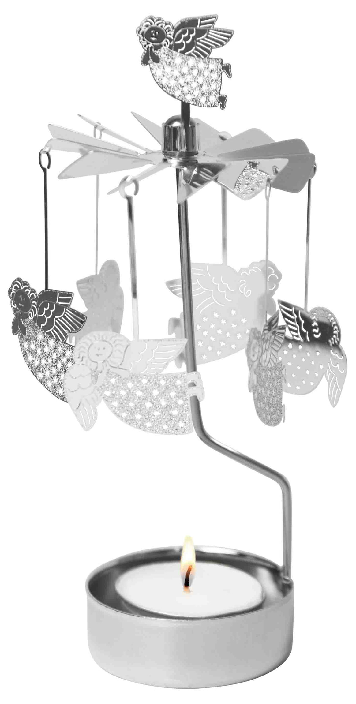 Skapa stämning med detta vackra änglaspel från Pluto Produkter, dekorerat med Lisa Larsons ikoniska änglar. När värmen från värmeljuset stiger börjar änglarna sakta snurra och sprida ett glittrande sken – en magisk detalj som ger både vardag och högtid en extra känsla av värme.