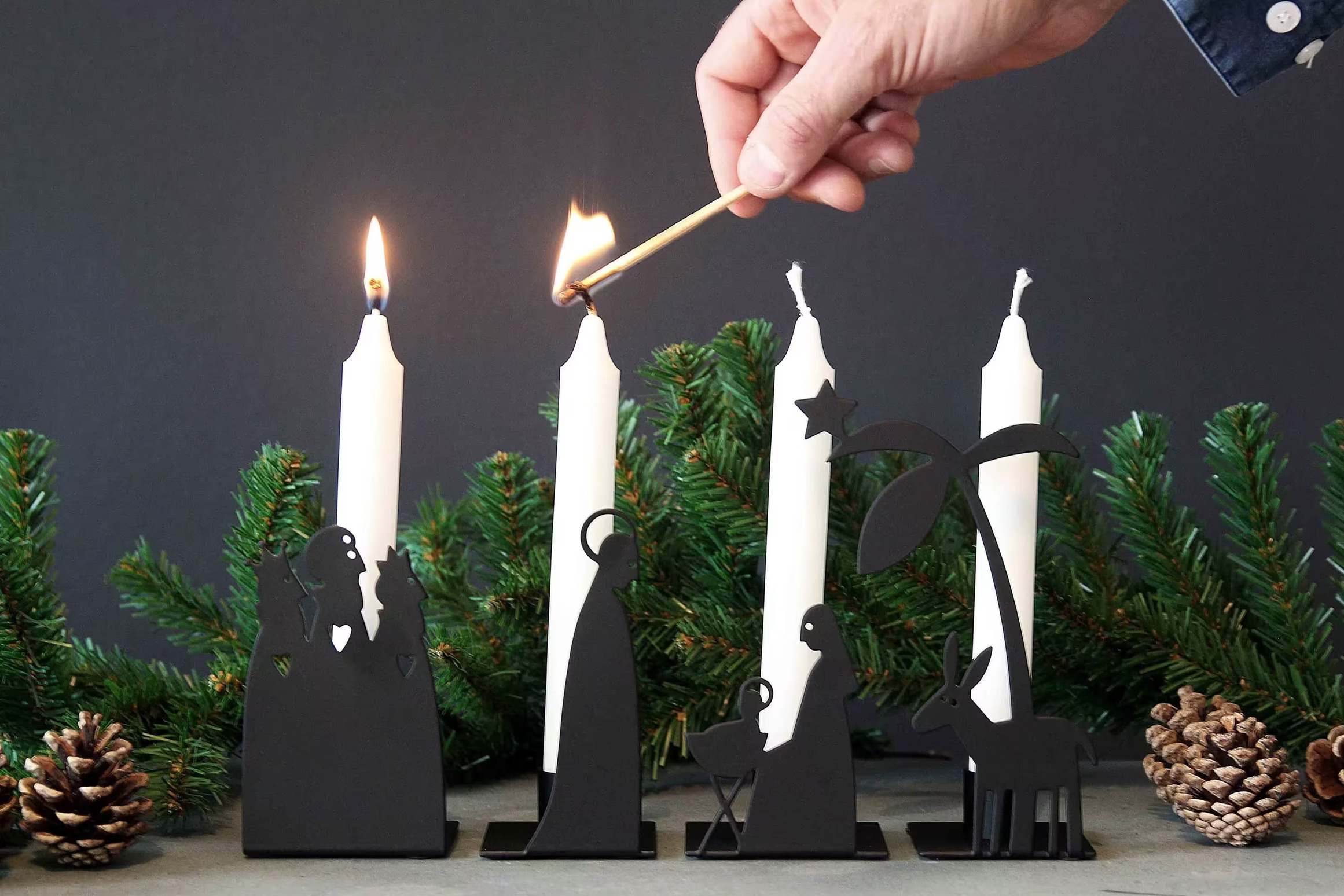 Vacker adventsljusstake i lackerad svart metall med motiv av krubban i Betlehem. Ljusstaken har 4 olika delar så man kan utöver som adventsljusstake även använda den som fristående ljusstake efter tycke & smak.