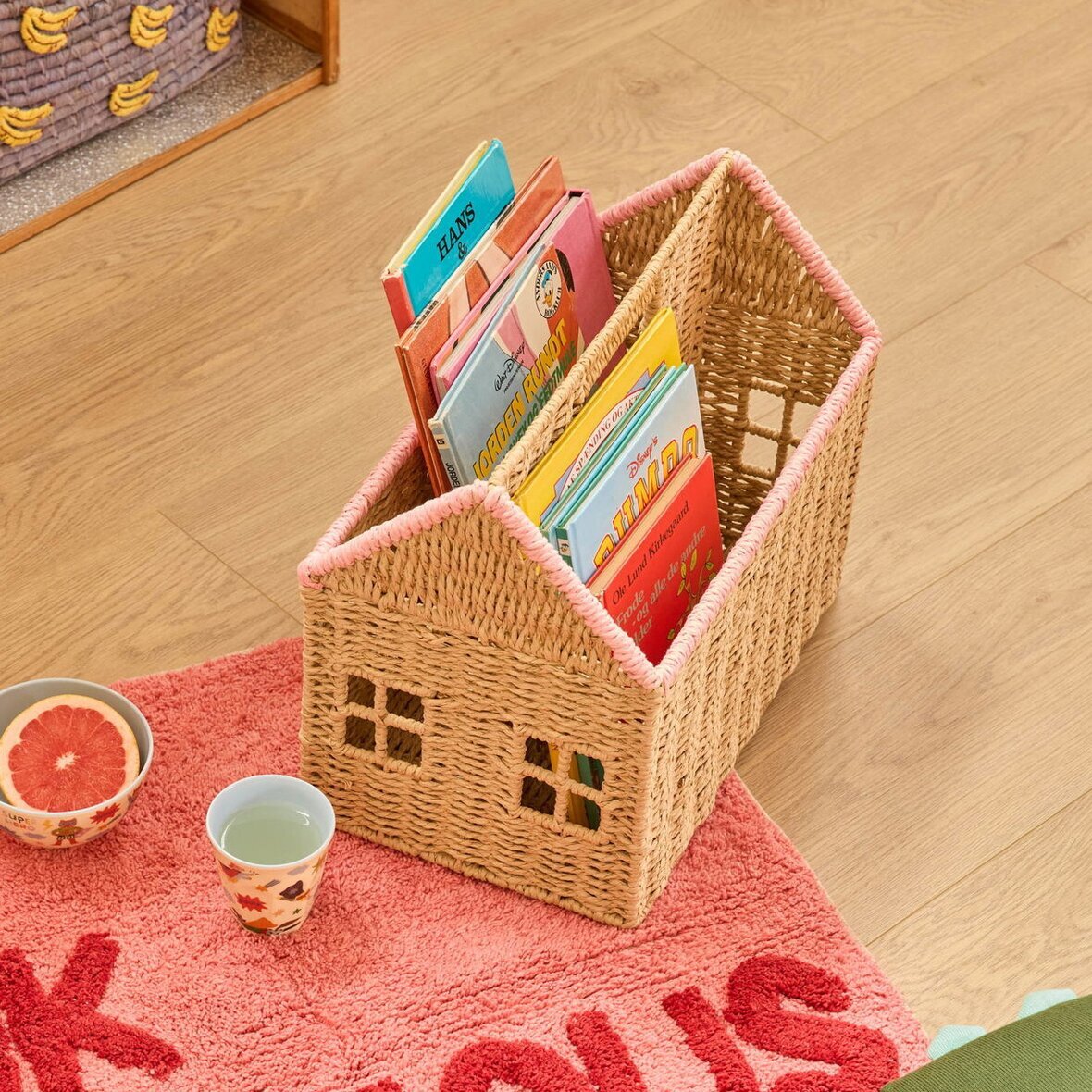 En superfin förvaringskorg i form av ett litet hus – perfekt till barnrummet. Korgen är handgjord i flätat naturmaterial och har söta fönsterdetaljer samt en mjuk rosa kant som ger den en lekfull och varm känsla.