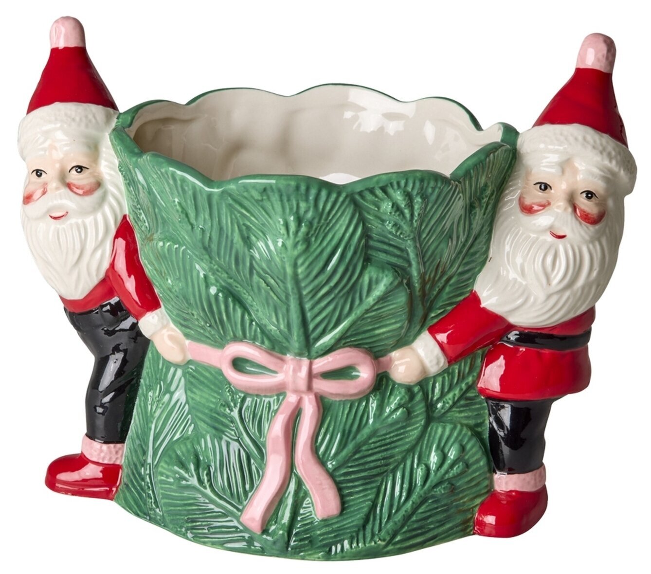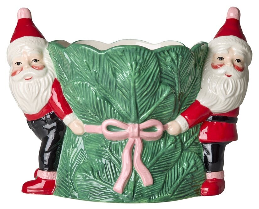 Skapa en härlig julstämning hemma med denna charmiga kruka i keramik. De två tomtarna som håller om det gröna paketet med rosa rosett gör den till ett lekfullt och dekorativt inslag i din inredning. Perfekt för julstjärnan, hyacinter eller andra växter som hör vintern till.