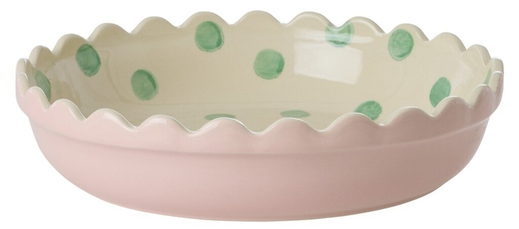 Charmig pajform i keramik som kombinerar lekfull design med praktisk funktion. Den vågiga kanten och de gröna prickarna på insidan ger en härlig retro-känsla, samtidigt som den rosa utsidan gör formen till ett riktigt blickfång på bordet.