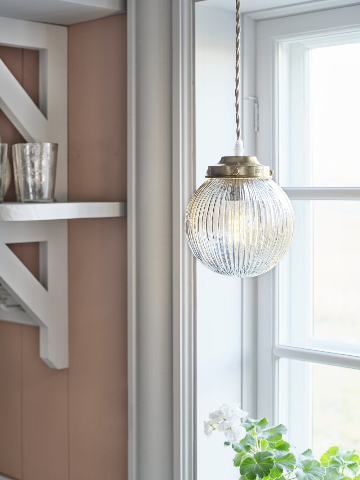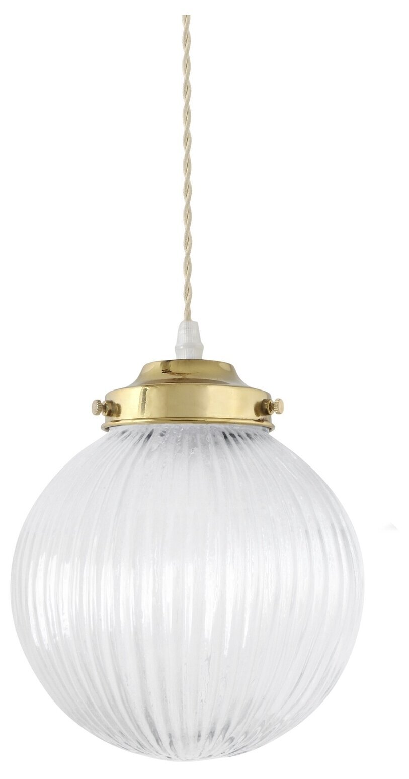 Taklampa Eivor har en rund glaskupa med räfflad struktur som ger ett mjukt och behagligt ljusspel. Den klara glasytan tillsammans med den eleganta mässingsfärgade fattningen skapar ett tidlöst och lyxigt uttryck som passar lika fint i moderna som i klassiska miljöer. Den tvinnade textilkabeln förstärker lampans charm och klassiska känsla.