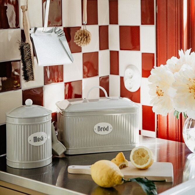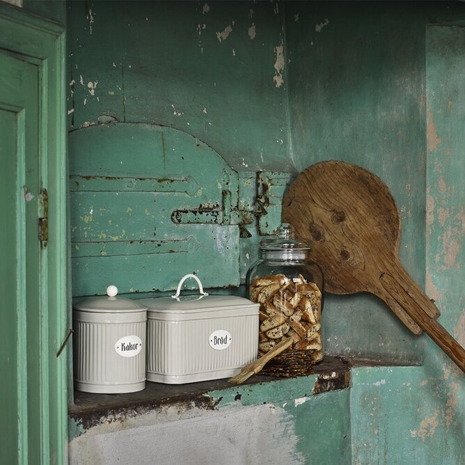 Plåtburk till förvaring av bröd, en fin detalj i köket. Från Strömshaga. Läs mer